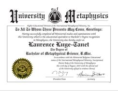 Les accompagnements que je propose se fondent sur mon profond chemin intérieur tout au long d'un parcours riche. Je suis titulaire d'un Bachelor's degree in Metaphysical Science (B. Msc - University of Metaphysic de Sedona) qui a fait suite à une aspiration née il y a 40 ans et à un parcours atypique.